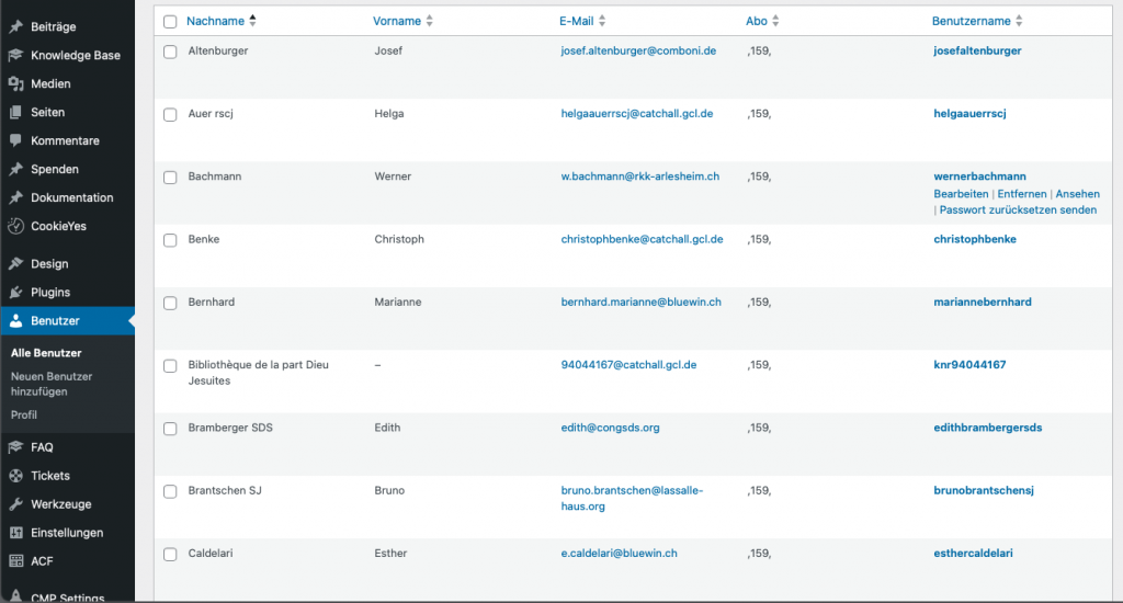 „Benutzer“ ist die zentrale Nutzerverwaltung von WordPress. Alle jemals auf der jeweiligen Seite registrierten Benutzer sind dort zu finden. asVerein greift auf diese Nutzerdatenbank zu –- beide Systeme sind immer synchron. Das heißt, dort sind alle Mitglieder zu finden, die auch in asVerein zu finden sind. Das lässt sich in vielen Fällen nutzen, in denen asVerein keine Möglichkeiten bietet, wenn es um die Suche nach oder auch den Überblick über Nutzer und Nutzergruppen geht.