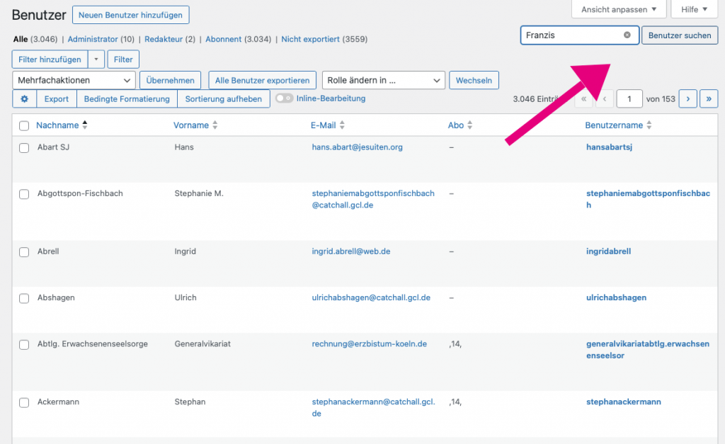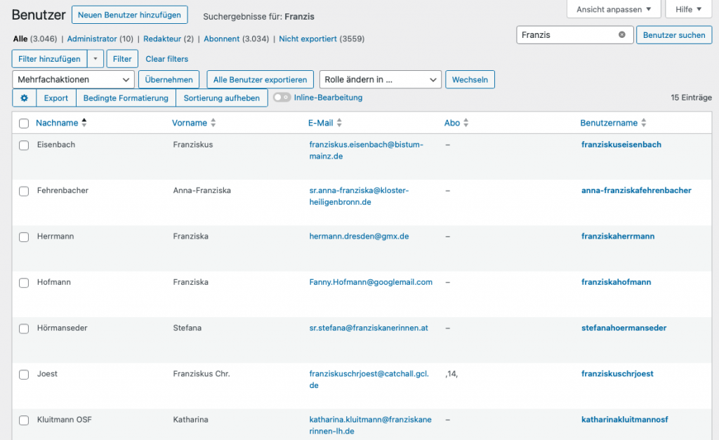 Die Suchfunktion von „Benutzer“ ist wesentlich wirkungsvoller als die von asVerein. Hier können alle Felder als Text durchsucht werden, d.h. es werden z.B. auch Firmen gefunden. Auch muss man nicht den korrekten Namen oder Suchbegriff kennen bzw. eingeben. So reicht es z.B., wenn man nach „Franzis“ sucht, um alle Treffer zu erlangen, die irgendwo das Wort „Franziskaner“ enthalten. Natürlich findet man auch alle „Franziskas“ oder „Franziskus“ …