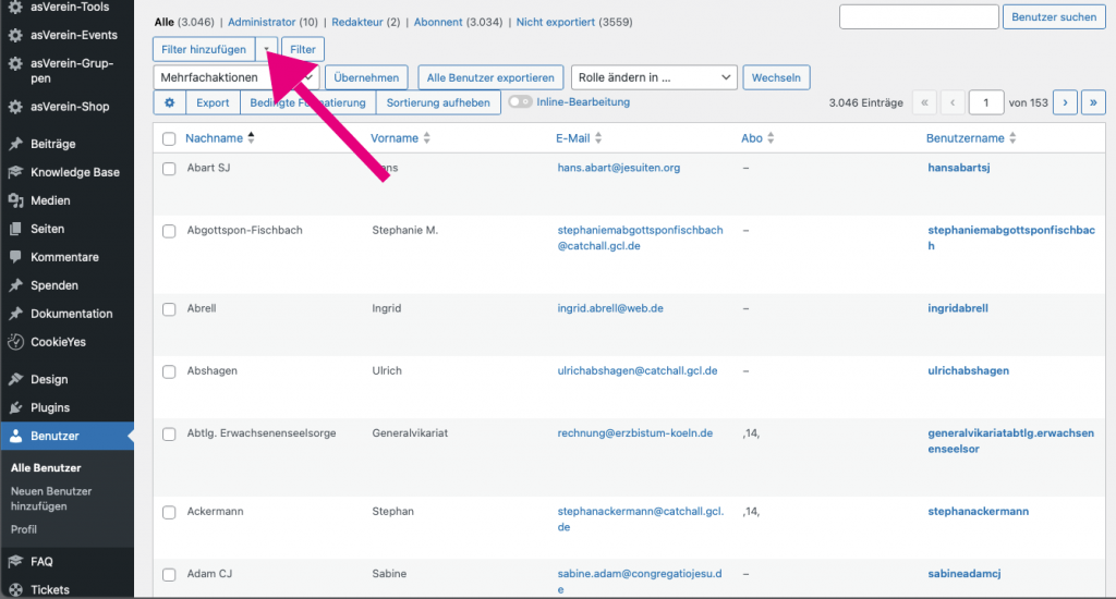 Solange das Programm asVerein keine Sortierfunktion beinhaltet, kann zum Sortieren bestimmter Mitglieder-Listen das WordPress-eigene Modul „Benutzer“ verwendet werden.