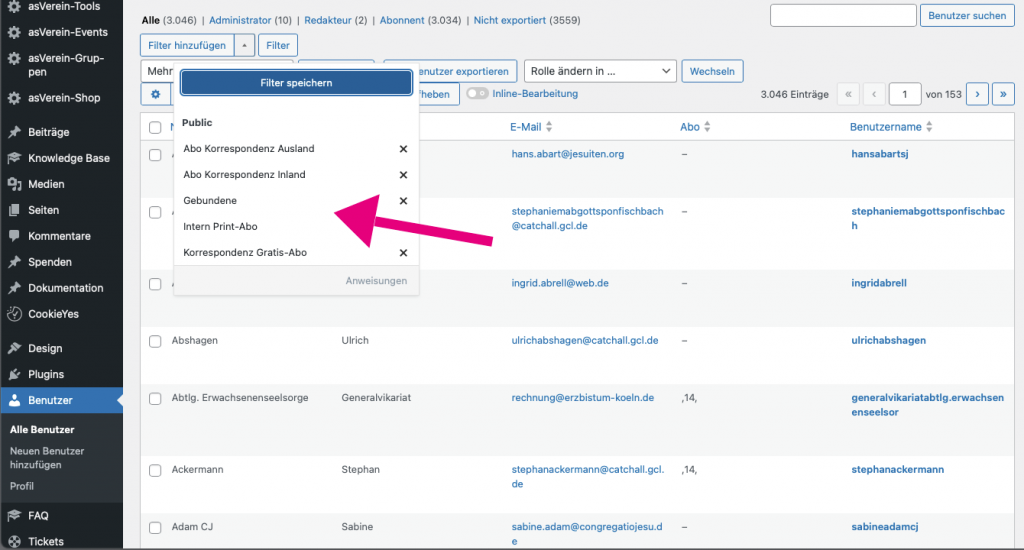 Die Benutzer können nach voreingestellten Filtern sortiert werden. Aktuell (Juli 2024) sind die „Mitgliedschaften“ aus asVerein als Filter auswählbar (Abos Korrespondenz, Intern Print-Abo, Gebundene), weitere Filter können nach Bedarf eingespeichert werden.