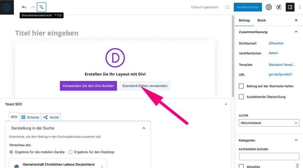 - Es öffnet sich der Editor. Hier „drängt“ sich der Divi-Builder in den Vordergrund, bitte den blasseren Button „Standard-Editor verwenden“ anklicken!