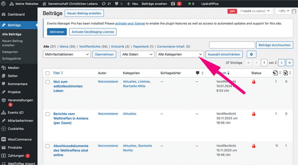 - Auf „Beiträge“ in der linken Menü-Leiste des Dashboards klicken.