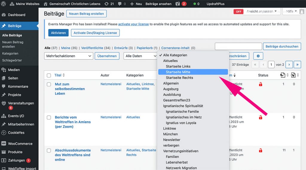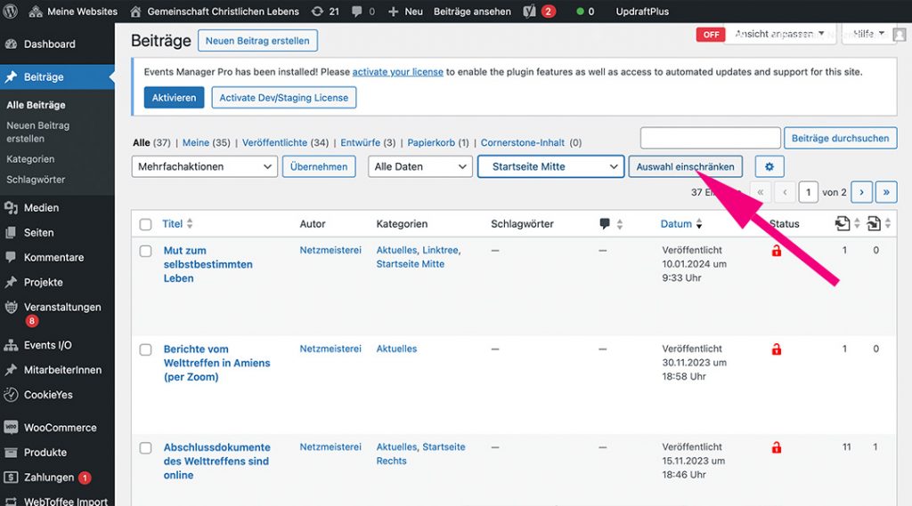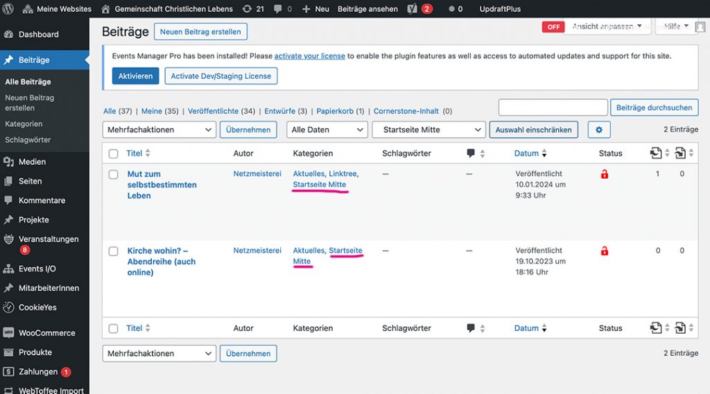 Falls auf der Startseite alle sechs Plätze mit Beiträgen belegt sind, muss festgelegt werden, welcher Beitrag von der Startseite verschwinden kann. Hat man sich für einen Beitrag entschieden, muss man in der Beitragsübersicht die Beiträge nach der Kategorie „Startseite …“ und der entsprechenden Spalte filtern. Jetzt werden nur noch die Beiträge angezeigt, die mit dieser Kategorie ausgezeichnet wurden. Das können unter Umständen auch mehr als zwei sein. Sobald ein dritter Beitrag mit einer Startseiten-Kategorie versehen wird, verdrängt dieser den jeweils älteren der beiden aktuellen Beiträge.