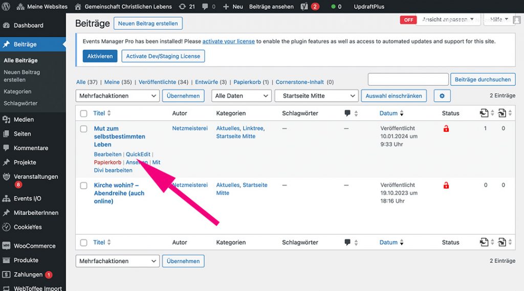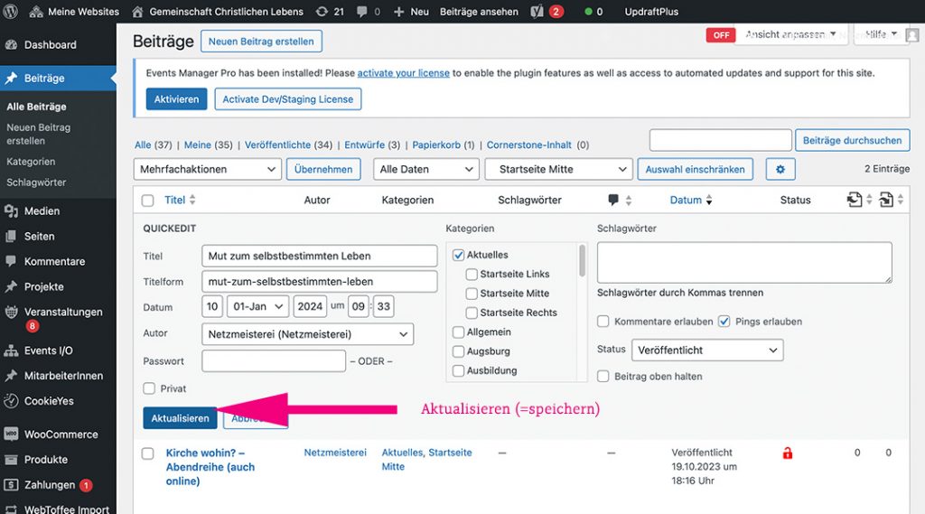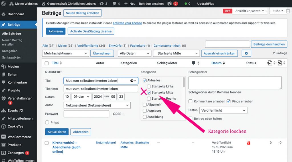 Man sucht nun die beiden Beiträge, die aktuell auf der Startseite zu sehen sind. Der Beitrag, der verschwinden soll, kann nun über „Quick-Edit“ direkt in der Übersicht bearbeitet werden. Man nimmt den Haken bei der Startseitenkategorie raus (Achtung: Nur die „Startseite“, die Kategorie „Aktuelles“ bleibt angehakt!). Hat man den gerade erstellten Beitrag schon veröffentlicht, kann man auch diesen auf die gleiche Weise direkt in der Übersicht bearbeiten und ihm die entsprechenden Kategorien zuweisen.