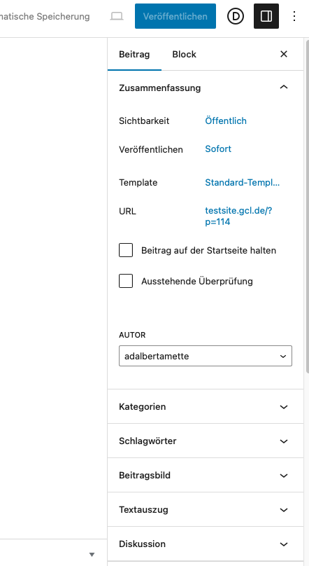 Wenn der Artikel vollständig ist und das Beitragsbild hochgeladen, kann der Beitrag veröffentlicht werden. Er ist dann noch nicht gleich auf der Website sichtbar (siehe nächste Punkte).