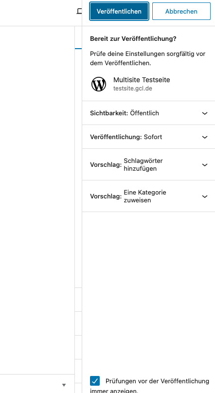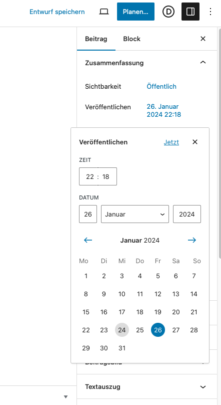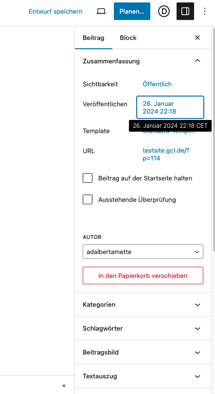 Zum Veröffentlichen des Beitrags bitte oben rechts in der obersten Spalte auf den (blauen) Button „Veröffentlichen“ klicken. Unten in der Seitenspalte steht an oberster Stelle der Punkt „Zusammenfassung“. Hier kann man auch ein späteres Datum zur Veröffentlichung eingeben, dann wird der Beitrag „geplant“ und erscheint zur festgelegten Zeit automatisch. Wenn man auf „Veröffentlichen“ bzw. „Planen“ klickt, kommt noch einmal eine Rückfrage, ob man auch an alles gedacht hat. Wenn der Beitrag ok ist, kann man final zustimmen und ihn veröffentlichen. Die Sichtbarkeit auf der Website wird im nächsten Schritt festgelegt.
