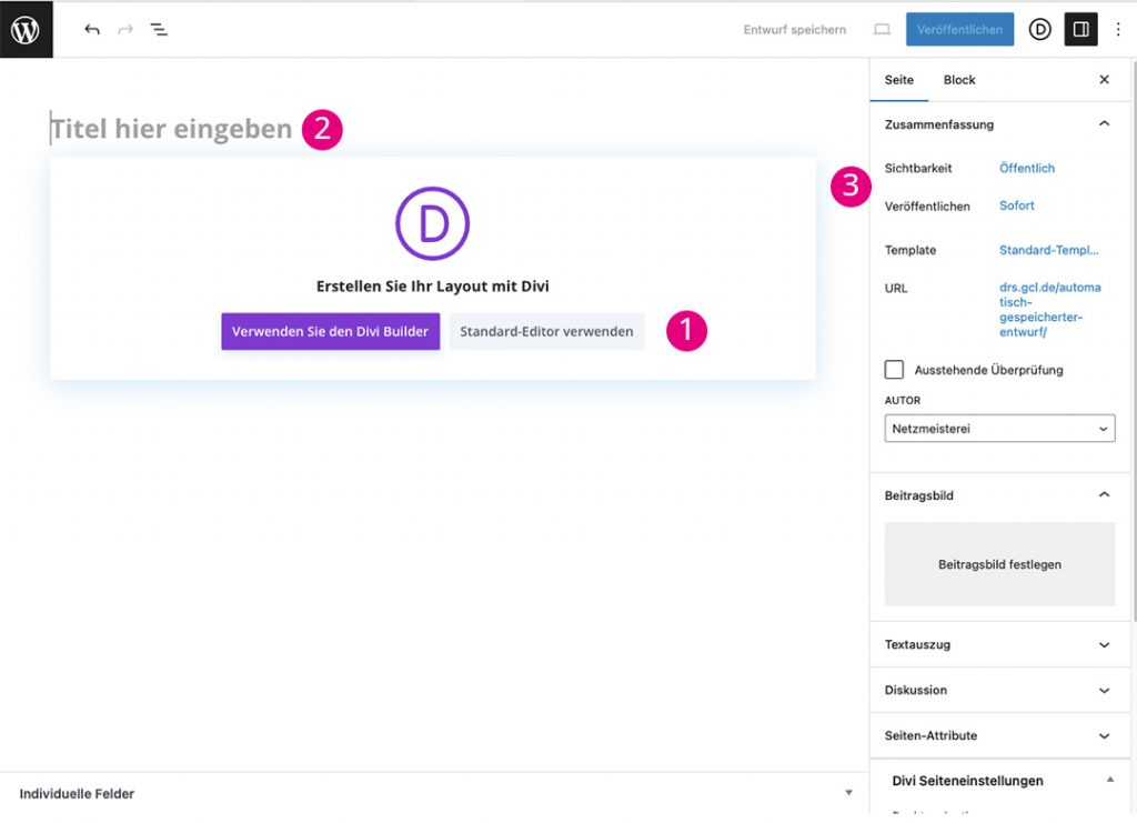 2 -> Hier den Titel der Seite eingeben. Dieser Titel erscheint auch in der Adresse im Browser (z.B. die Seite mit dem Titel „Kontakt“ erscheint unter gcl.de/kontakt. Längere Titel werden in der Adresse mit Bindestrich dargestellt. Seitentitel sollten so kurz und prägnant wie möglich sein. Sprechende „Überschriften“ kann man auf der Seite selbst einsetzen, unterhalb des Titels.