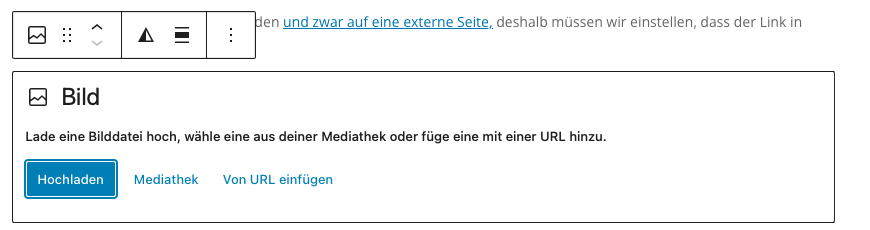 Sobald Sie sich für den Bild-Block entscheiden, können Sie zwischen Hochladen,Mediathek und Von URL einfügen wählen.