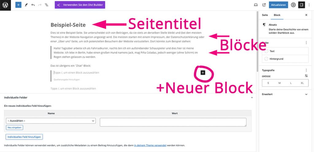 Im Prinzip würden diese beiden Blöcke schon ausreichen, um eine Seite mit Inhalt zu füllen. Aber oftmals wollen wir es natürlich noch etwas schöner oder ausführlicher. Es gibt für so gut wie jede Formatidee einen Block: einen für Bilder, einen für Bilder-Galerien, einen für Listen, einen für „Zitate“ (mit Quellenangabe). Darüber hinaus gibt es auch reine Layoutblöcke, die wichtig sind, vor allem zwei: Spalten und Abstandshalter.