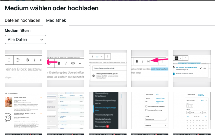 Die Mediathek enthält alle vorhandenen Bilder. Über den gleichnamigen Reiter können Sie Dateien hochladen:
