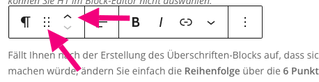 Fällt Ihnen nach der Erstellung des Überschriften-Blocks auf, dass sich die Überschrift oberhalb des Absatz-Blocks besser machen würde, ändern Sie einfach die Reihenfolge über die 6 Punkte am linken Rand eines Blocks. Sie können einen Block mit Hilfe von Drag & Drop verschieben. Eine blaue Linie erscheint an der Stelle, wo der Block eingesetzt würde. Oder aber, Sie klicken über die Pfeileden Block an die gewünschte Position.