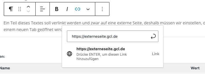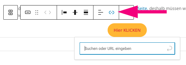 Damit der Button auch auf ein Ziel verweist, muss er noch verlinkt werden. Das funktioniert nach der bereits bekannten Methode über das Link-Icon in der Block-Bearbeiten-Leiste über dem Block.