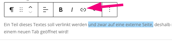 Markieren Sie einen Textteil und verlinken diesen über das Link-Bedienelement (Büroklammer-Icon) über die Block-Werkzeugleiste. Zum Aufheben der Verlinkung klicken Sie erneut auf das Bedienelement.