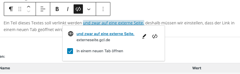 Tipp: Beim Verlinken auf externe Websites stellen Sie den Regler In einem neuen Tab öffnen auf „an“. Sie wollen ja nicht, dass Ihre Besucher Sie verlassen. Dafür müssen Sie nach dem Setzen des Links noch einmal auf den Link klicken, dann öffnet sich eine etwas andere Ansicht, hier können Sie den Regler auf „an“ stellen.