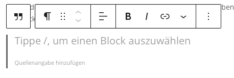 Der Zitat-Block bietet Ihnen die Möglichkeit, ein Zitat mit einer besonderen Hervorhebung zu versehen (Balken am linken Einzug, Text eingerückt, Quelle in kleinerer Schrift darunter, beides wird als ein Block angesehen.