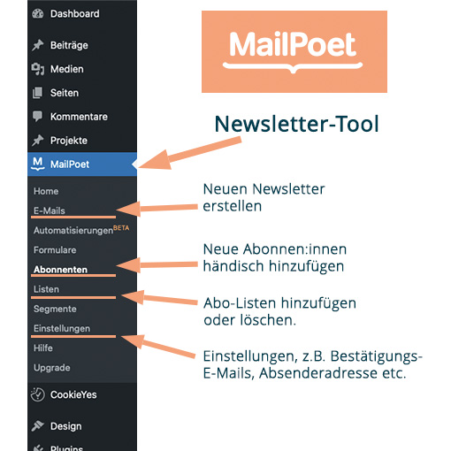 Das Newsletter-Tool befindet sich auf der Unterseite newsletter.gcl.de. Es heißt MailPoet und findet sich unter diesem Namen in der Seitenleiste auf dem Dashboard.