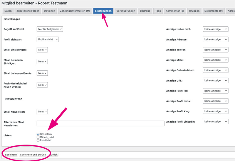 Wer ein GCLintern-Abo erhalten soll, bekommt in der asMitgliederverwaltung einen Haken bei den „Newsletter“-Listen. Diese findet man ganz unten unter dem Reiter „Einstellungen“, wenn man in der Kartei des jeweiligen Mitglieds ist.