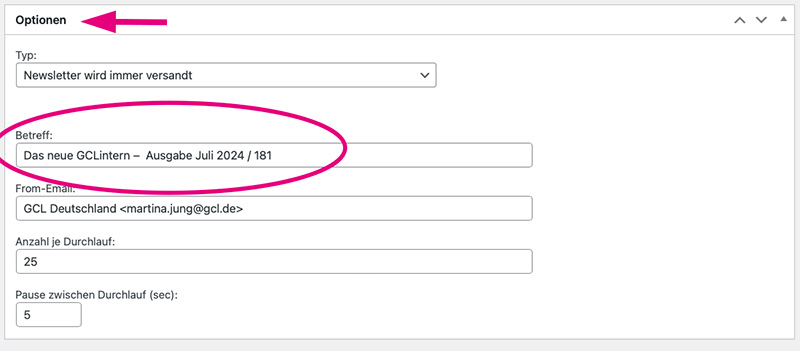 Optionen: Hier wird die Betreffzeile der E-Mail angepasst