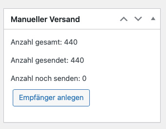Wenn der richtige Betreff eingetragen und die richtige Datei hochgeladen ist, ist das Mailing versandbereit. Es ist empfehlenswert, immer zuerst einen Testversand an die eigene E-Mail-Adresse oder die einer anderen Person, die noch einmal drüberschaut, zu schicken. Wenn alles passt, wird die Empfängerliste angelegt. Hierzu in dem Feld „Manueller Versand“ auf „Empfänger anlegen“ klicken. Nun wird angezeigt, wie viele E-Mails verschickt werden. Anschließend auf „Jetzt Senden“ im Feld „Versand“ klicken.