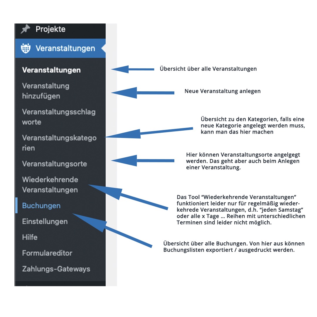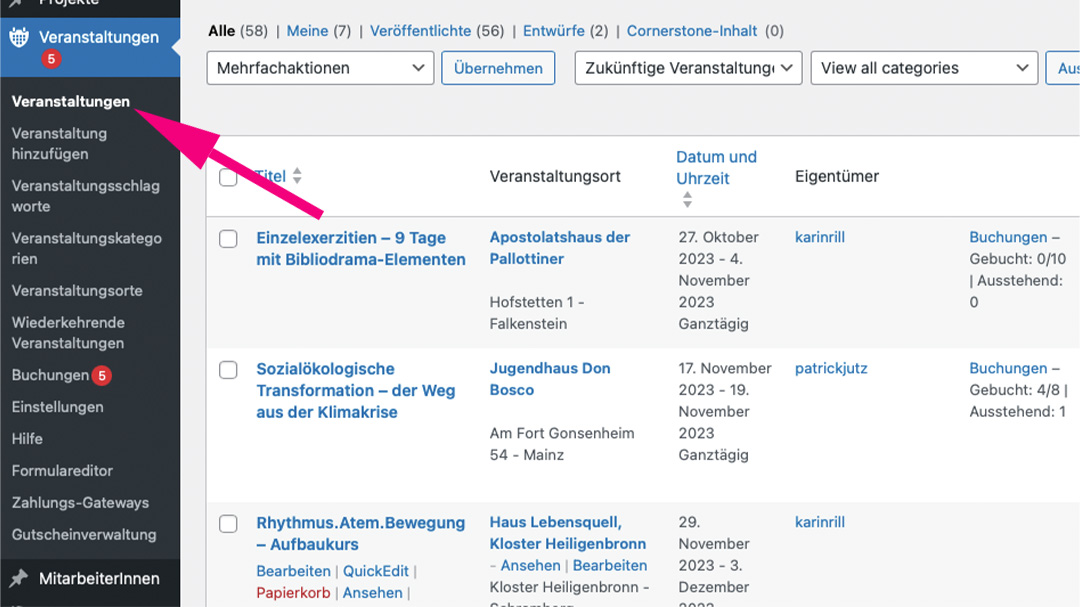 Es findet sich in der Seitenleiste im Dashboard unter „Veranstaltungen“