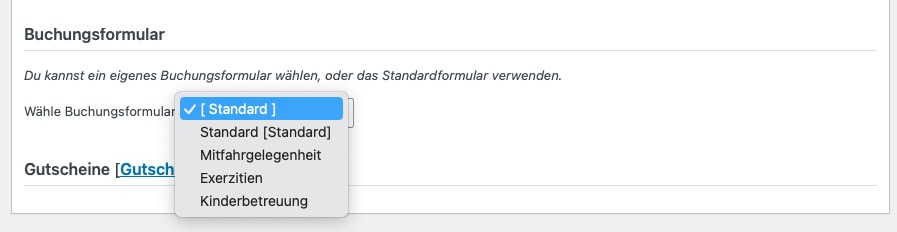 WICHTIG! – Je nach Veranstaltung sollen unterschiedliche Informationen bei der Anmeldung abgefragt werden. Aktuell kann man dies über die Wahl des Buchungsformulars steuern. Es gibt neben dem Standard-Formular noch drei weitere Buchungsformulare:
