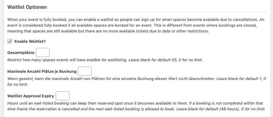 Maximale Plätze pro Buchung: Wenn man hier nichts einträgt, kann immer nur ein Platz auf der Warteliste „gebucht“ werden. Trägt man den Wert „0“ ein, gibt es keine Beschränkung.