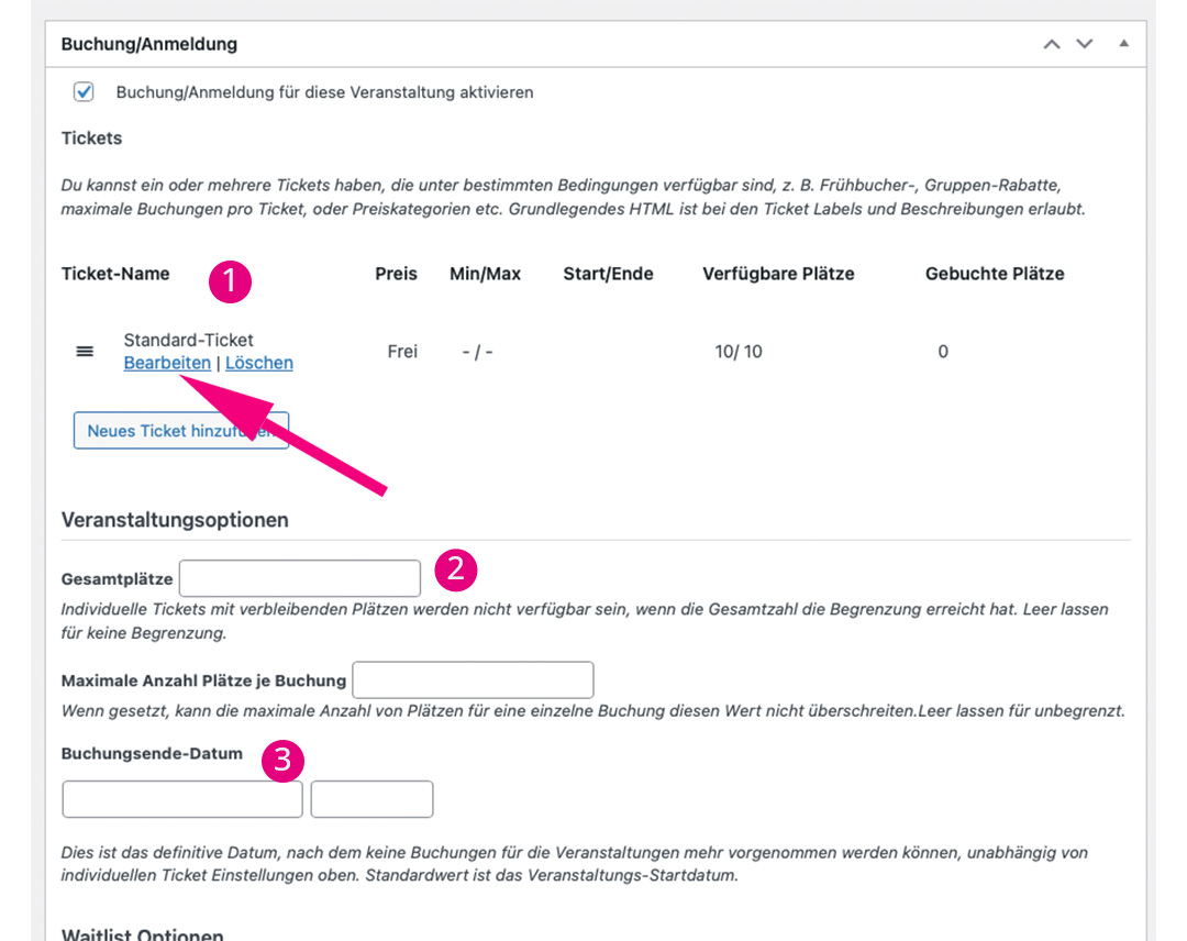 Wie schon beschrieben wird hier die Gesamtzahl der Plätze angegeben. Wenn diese durch Buchungen erreicht ist, wird die Warteliste aktiv. Dazu mehr unten.