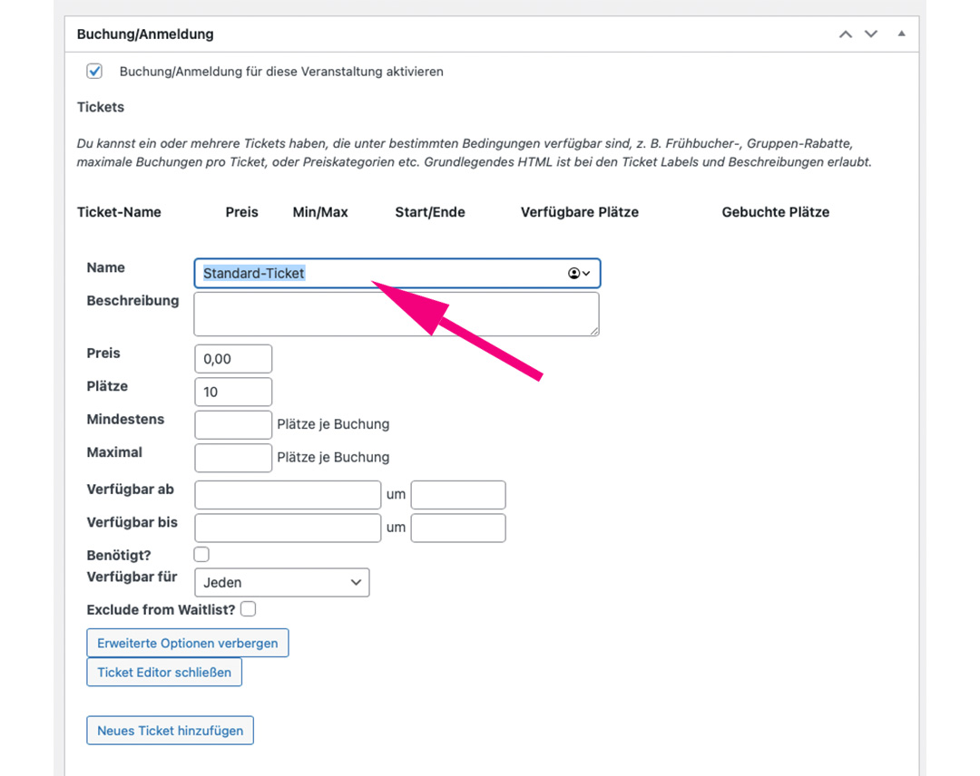 Hier sollte zunächst der Name des Tickets so angepasst werden, dass klar ist, wofür bezahlt wird. In unserem Fall wird das in der Regel die Kursgebühr sein. Man kann, wenn notwendig, auch noch eine kurze Beschreibung zu diesen Kosten hinzufügen.