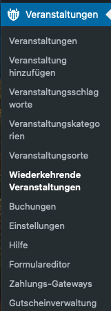 „Wiederkehrende Veranstaltung“ ist ein eigenes Tool, es findet sich in der Menüleiste unter „Veranstaltungen“ etwas weiter unten zwischen „Veranstaltungsorte“ und „Buchungen“.