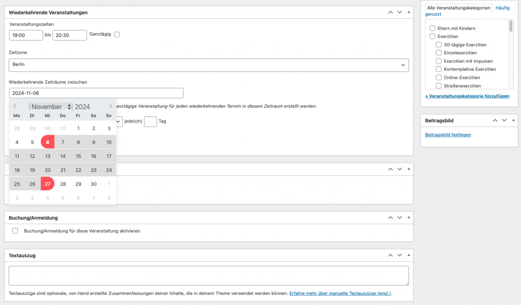 - Wiederkehrende Zeiträume zwischen – Hier wird der Zeitraum eingegeben, innerhalb dessen die einzelnen Veranstaltungen stattfinden, z.B. die Abendreihe „mehr vom Leben“ findet vom 6. bis 27. November an jedem Mittwoch-Abend statt. Dann wird dieser Zeitraum hier eingegeben.