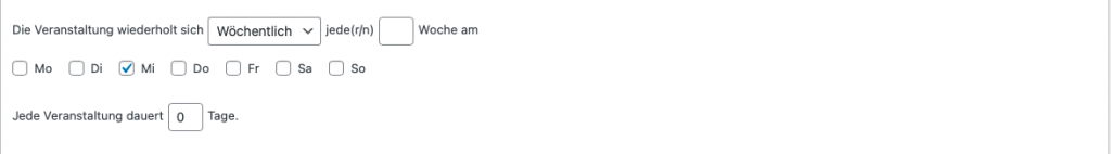 - Darunter kann man eingeben, wann und in welchem Rhythmus die Veranstaltung stattfindet: Im oben genannten Beispiel wäre das „wöchentlich“, Haken bei „Mittwoch“, „Jede Veranstaltung dauert 0 Tage“ (da es nur eine Abendveranstaltung ist).